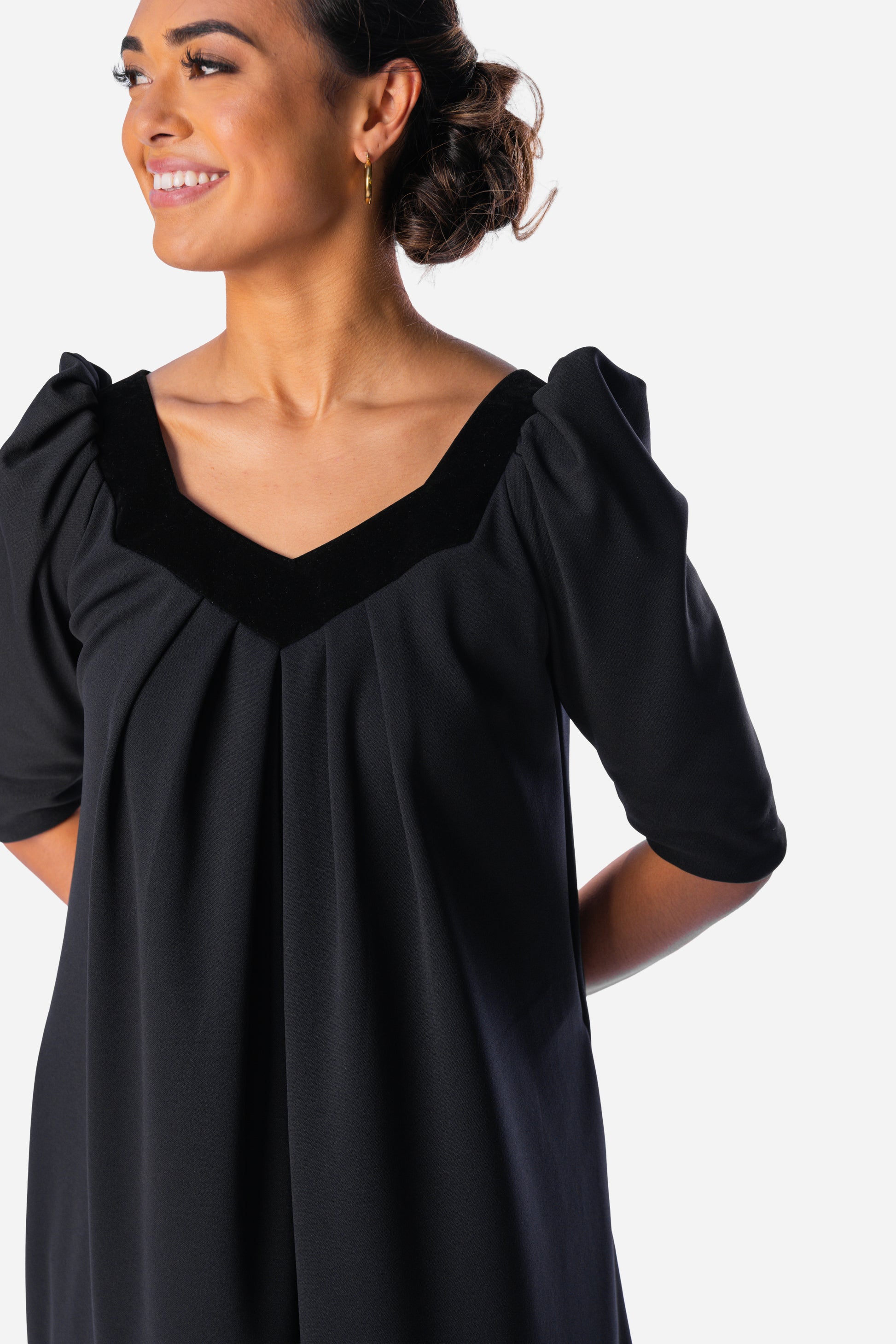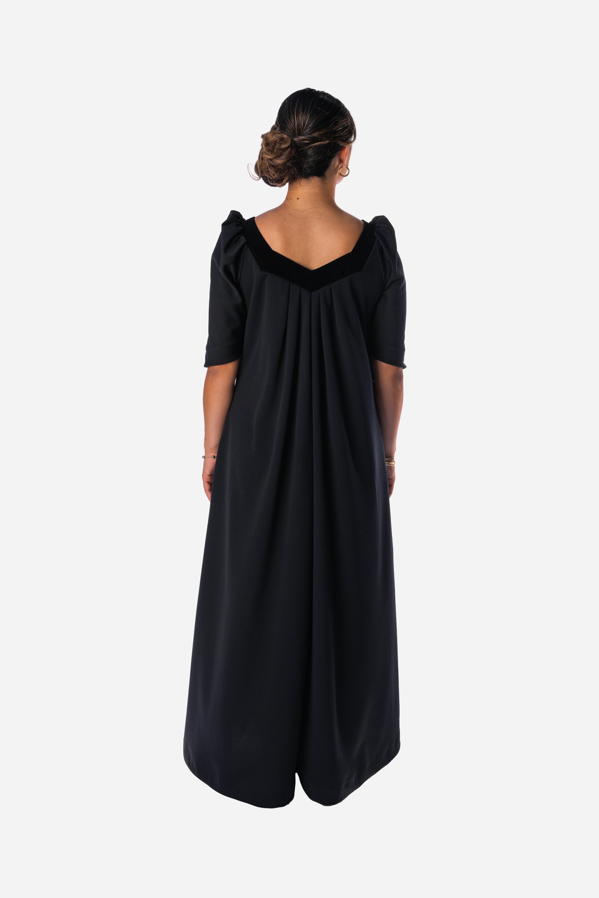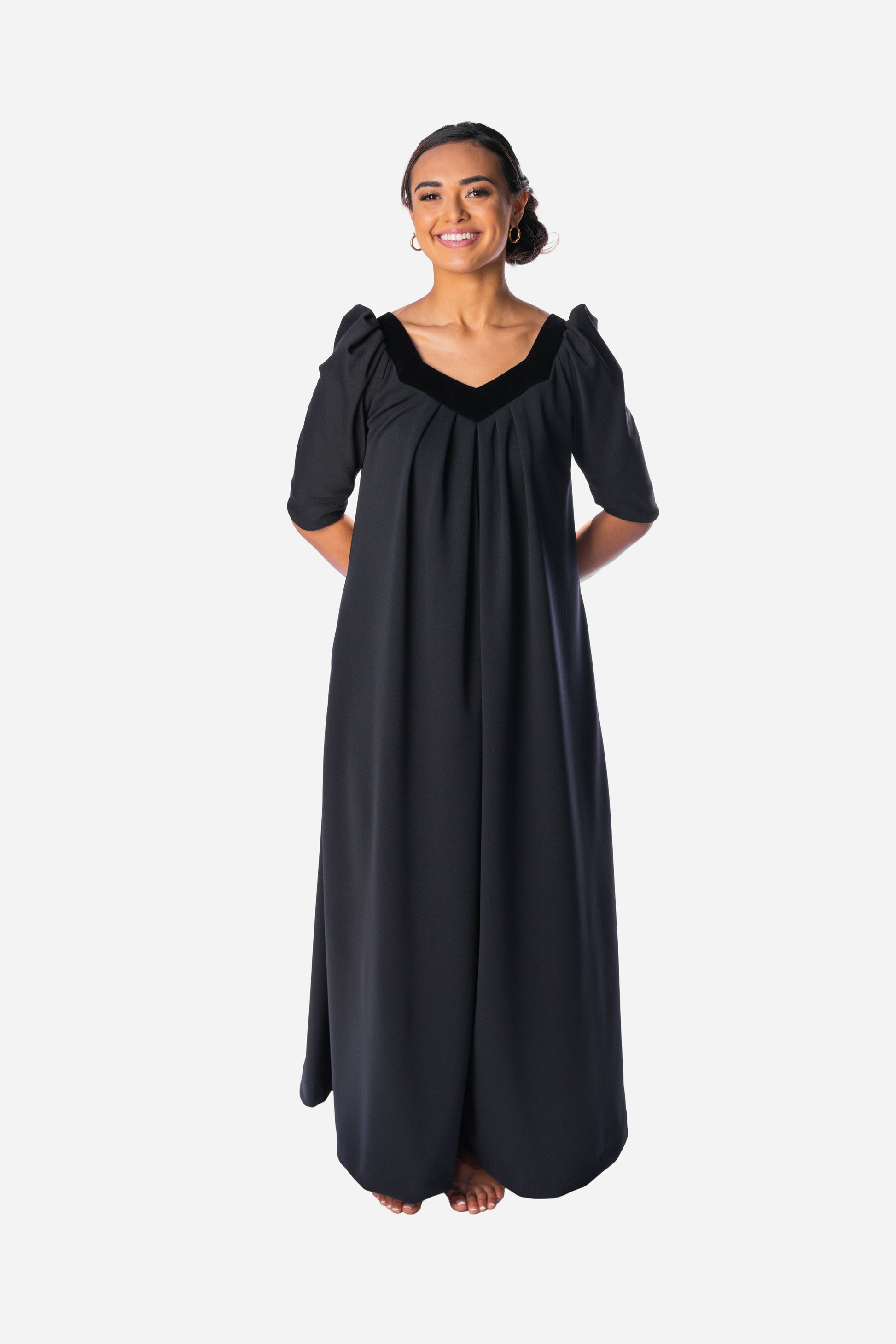 A beautiful long muʻumuʻu featuring a luxurious velvet-trimmed neckline for an elegant, timeless look. Soft, comfortable, and designed...